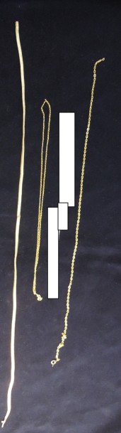1 Articulated Gold Necklace, Eagle Head Punch. Accidents and shortages. Weight: 11.3 gr 2 chains in yellow gold. Punch head of eagle. Weight: 1.6 gr and 4.3gr 1 golden curb 7 July 1930, Punch eagle head, Weight: 3.8 gr 1 yellow gold wedding ring, Wei