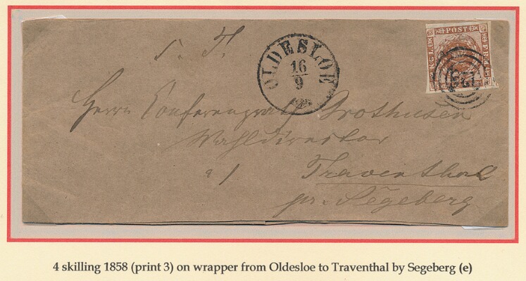 1858. 4 sk. brown. Single on WRAPPER from Oldesloe to Segeberg. WERY RARE USAGE. Cert. Møller AIEP