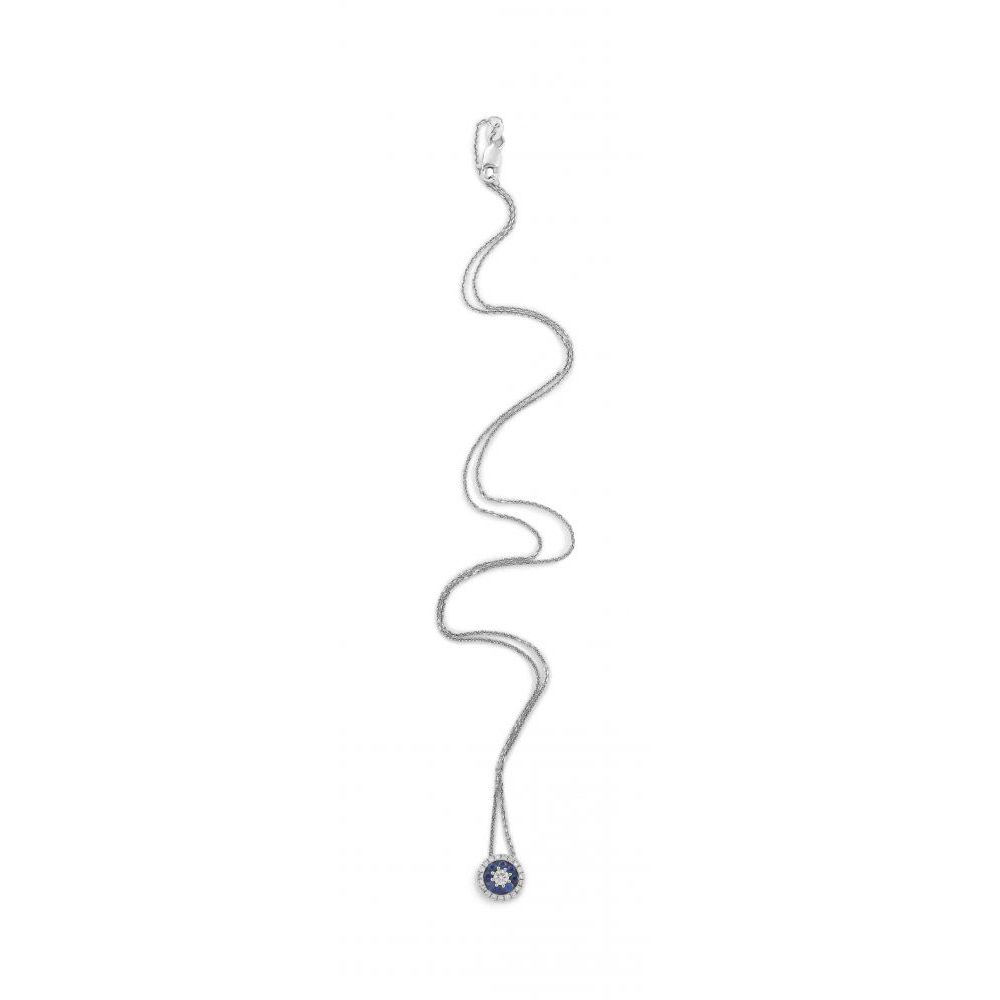 claw-set to the centre with a round brilliant-cut diamond enclosed by eight round-cut blue sapphires weighing approximately 0.27 carat, enclosed by pavé-set round brilliant-cut diamonds, with a fine 18ct white gold chain, claw and ring clasp, length