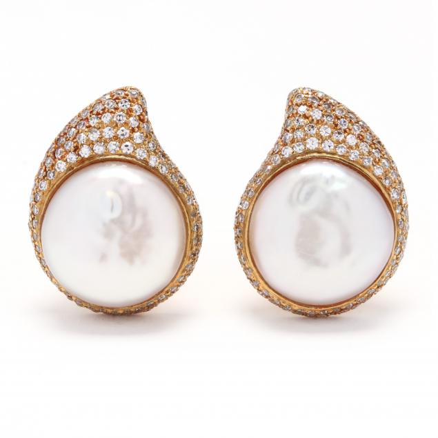 Each set with a button pearl (13.0mm) in a gold tear form mount with pavè set single cut round diamonds weighing approximately .70 total carat (F-G color, VS clarity), completed with omega clip backs, stamped 1980 Tiffany & Co. 18K. 7/8 in. 10.2 dw