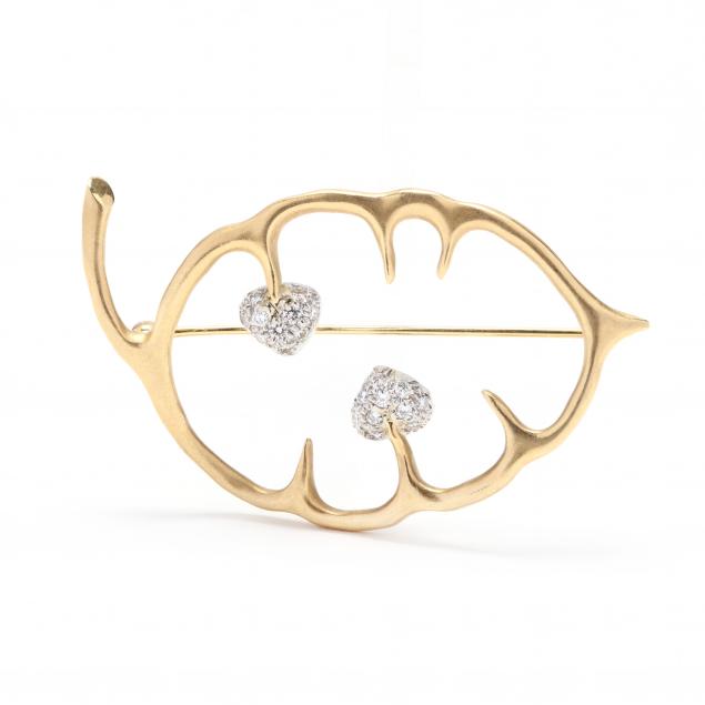 In an open leaf design set to the interior with platinum heart motifs with bead set full cut round diamond accents weighing approximately .35 total carat (F-G color, VS clarity), completed with a single pin stem, stamped 1999 / Cummings / 750. 2 in.