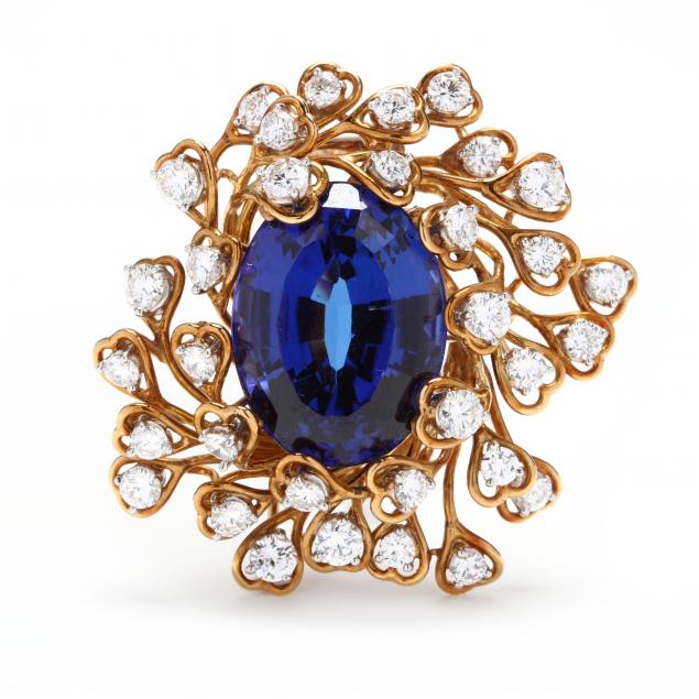 In a floral motif centering on an oval, modified step cut tanzanite (20.80 x 15.72 x 12.09mm) weighing approximately 25.38 carats and surrounded by an asymmetrical cluster of (33) round brilliant cut diamonds (2.9mm - 3.5mm) in a gold heart motif set