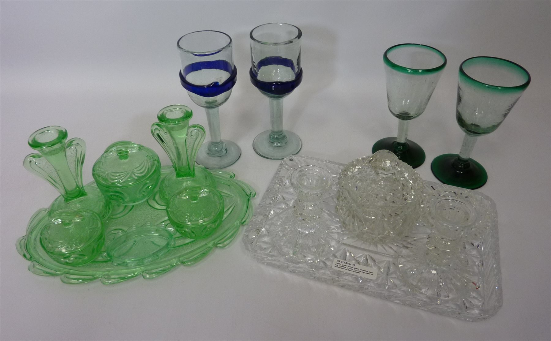 1930's green tinted glass dressing table set