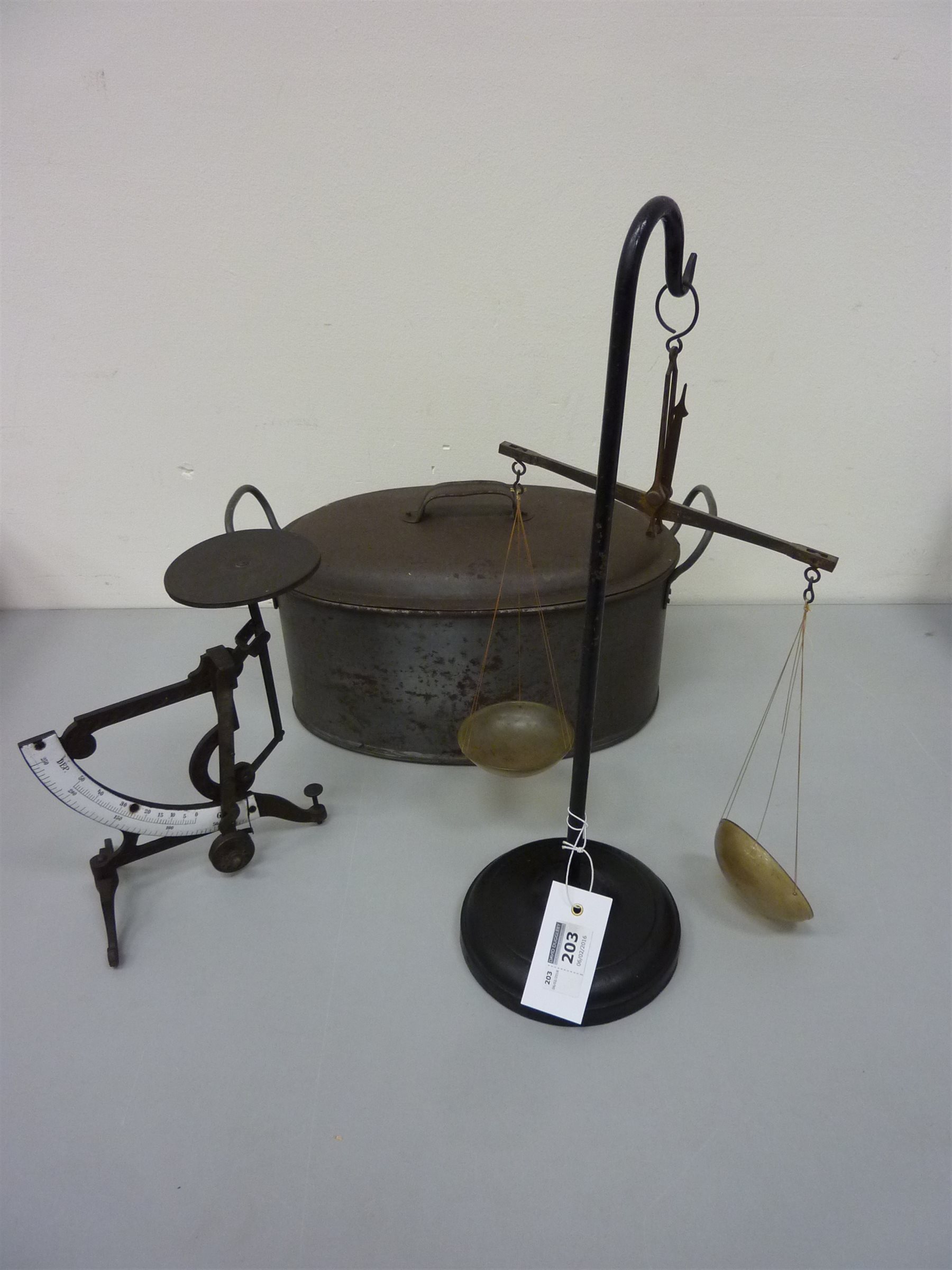 19th century fish kettle, early 20th century kitchen scale, another set of scales