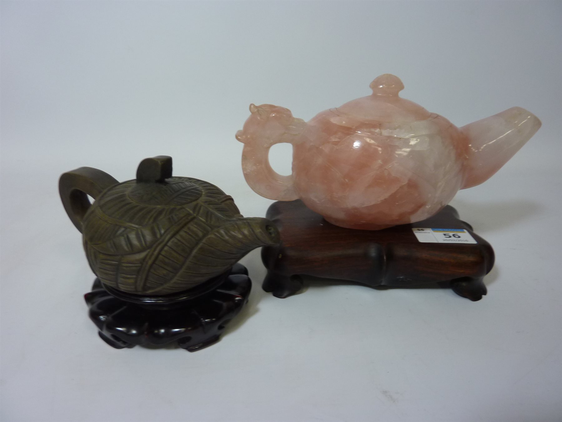 20th century Chinese carved rose quartz teapot H11cm and another oriental ceramic teapot (2)