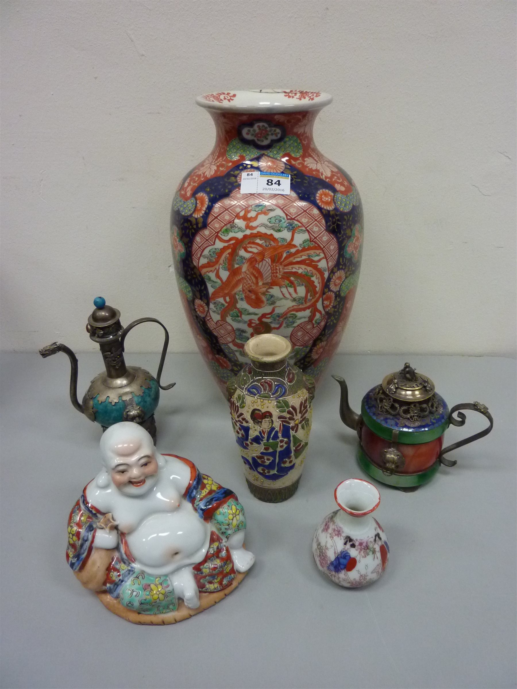 20th century Japanese Imari vase H32cm, oriental decorative polished hardstone and metalwork tea pot, and other oriental items