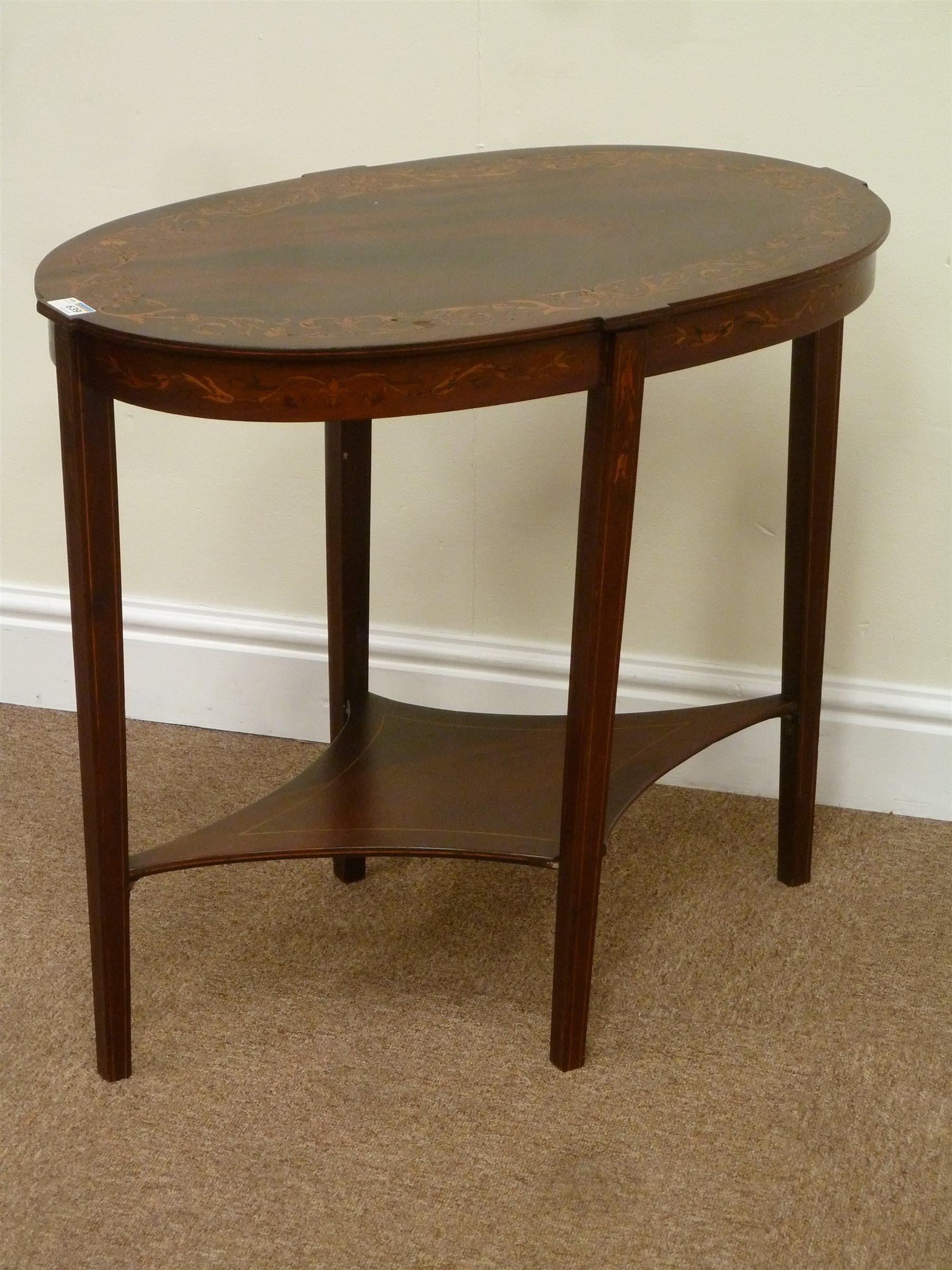 20th century oval shaped mahogany two tier occasional table, with inlaid decoration