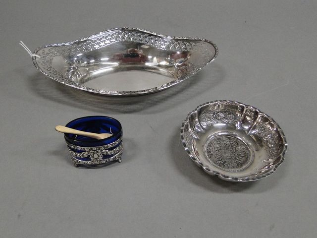 2st skålar varav ett med monterat mynt och saltkar med glasinsats, silver, total vikt 197g