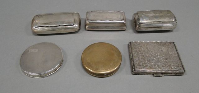 puderdosa silver D7cm samt cigarett etui, snusdosa nysilver, pillerburk mässing