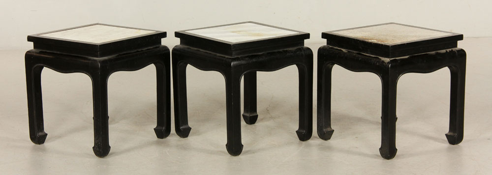 Lot of three Chinese black lacquer stands, with marble top, 16" h x 14" sq