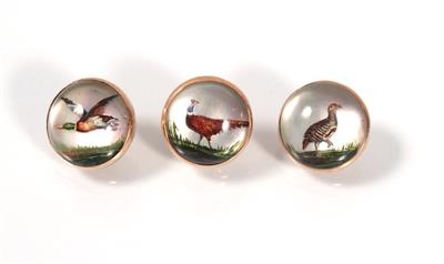 Gold 580, geschnittener Bergkristall mit Bemalung "Federwild" auf Perlmutt, österr. Amtspunze 1872-1922, 6,7 g