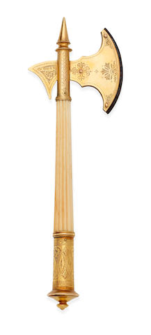 A 15 CARAT GOLD AND IVORY LAUNCHING AXE FOR THE IRISH FERRY S.S. ULSTER, WALTER & JOHN BARNARD, DATED LONDON 1895,