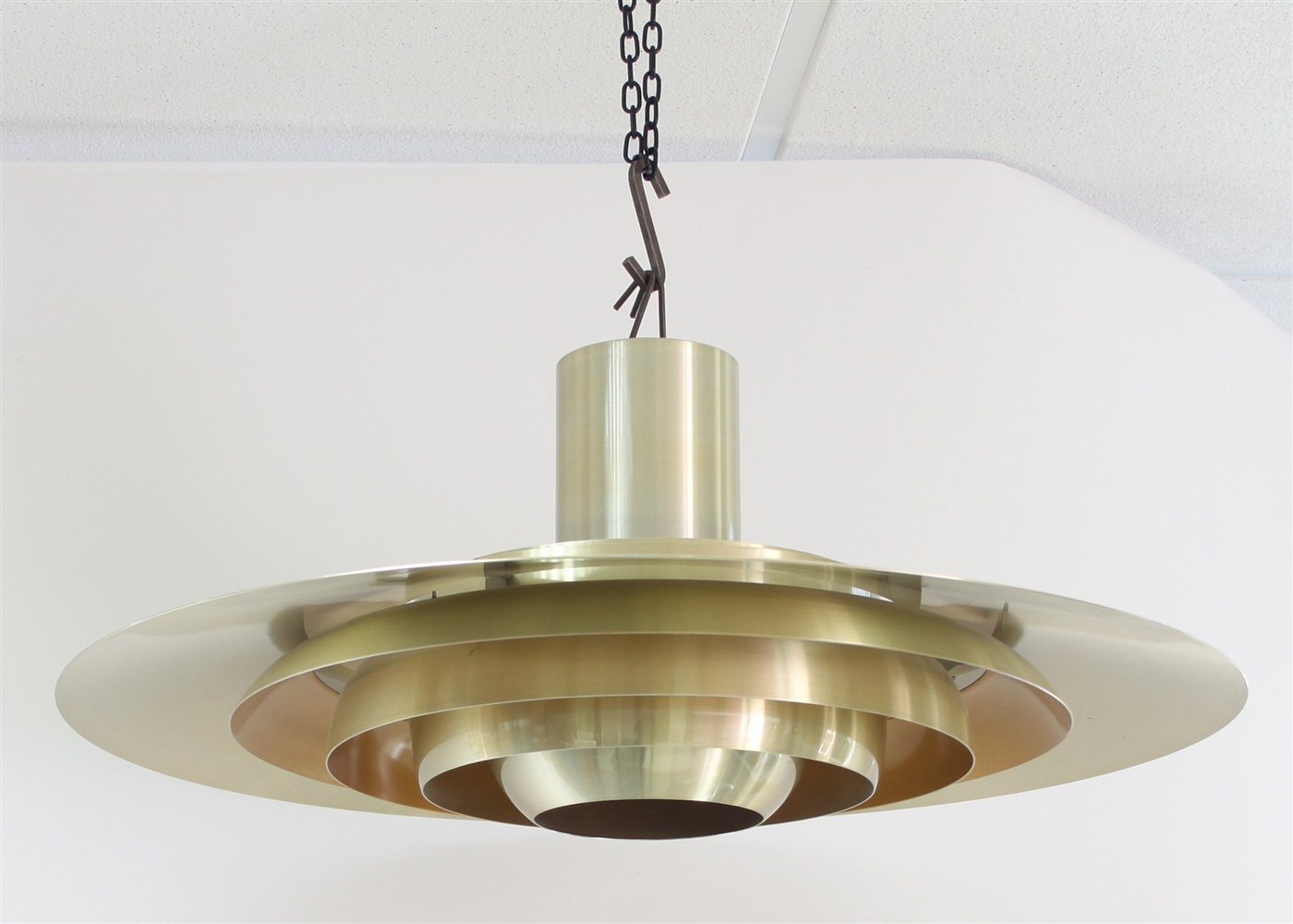 the brushed metal with gilt finish, of circular form with tiered circular bands to centre, 69cm wide