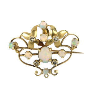 The oval opal cabochon, within a brilliant-cut diamond and circular opal cabochon scroll and floral surround. May be worn as a brooch. Estimated total diamond weight 0.40ct. Hallmarks for London, 1973. Length 3.6cms. Weight 7.3gms