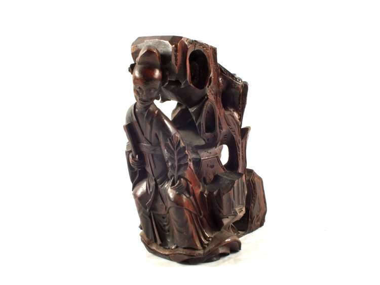 A 19th Century Chinese carved wooden figure holding a fan in one hand and a sprig in the other