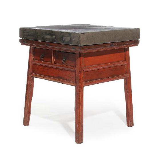 A 19th century Chinese stone top table with red lacquered frame