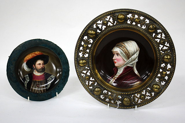 A 19TH CENTURY CONTINENTAL PORCELAIN PLATE with a handpainted portrait of a female bust and mounted in a pierced gilt frame, overall 28cm diameter together with a further framed continental porcelain portrait plate (2)