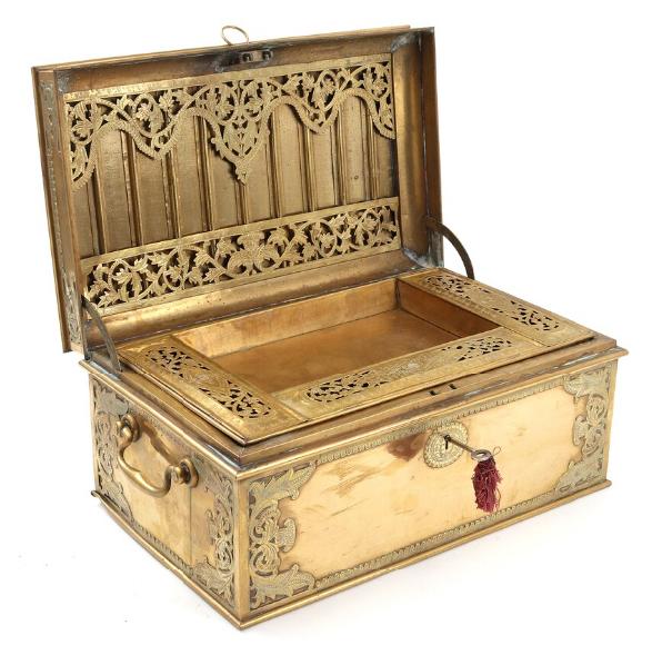 A 19th century French brass document box with engraved and laced mountings and covers