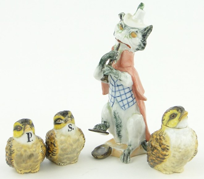 A 19th century German porcelain 3-piece cruet set in the form of partridges, with blue anchor mark under, largest height 3'', together with a continental porcelain grotesque musical animal figure, (4).