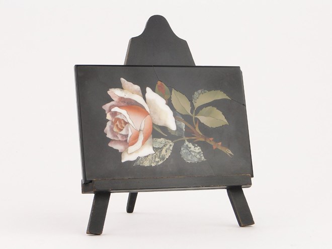 A 19th century Italian pietra dura plaque with rose decoration, length 7'', on stained wood easel.