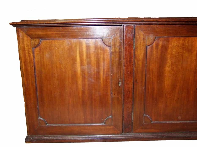 the upper section enclosed by three glazed doors, with three panelled drawers beneath, on plinth base,