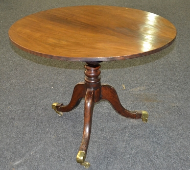 A 19th Century mahogany snap-top supper table of circular form, with a turned pedestal and tripod base with applied brass castors, diameter 98cm.