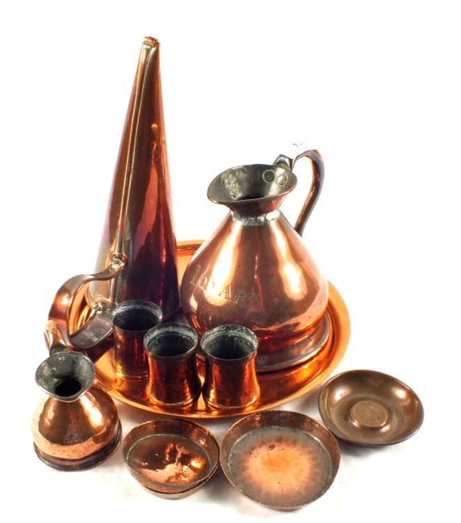A 19th Century Quart and Gill jugs, an ale mull and other Copper
