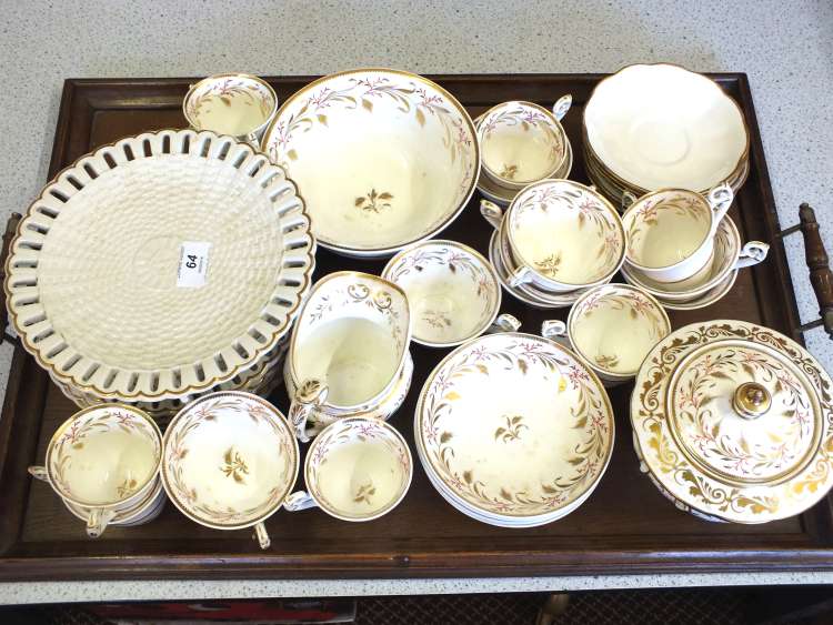 A 19th Century Rockingham style gilt and floral tea set, a Victorian pottery comport set and other saucers