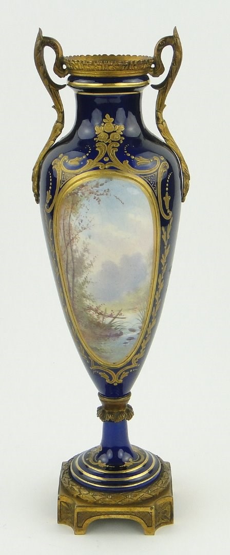 A 19th century Sevres porcelain vase, with painted panels and ormolu mounts, 14.5''.