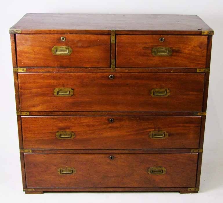 A 19th Century teak military chest, in two parts, fitted with two short and three long drawers