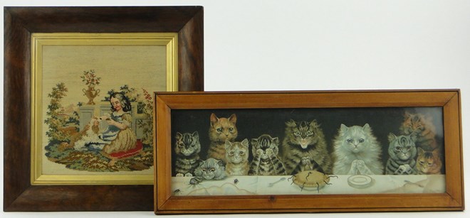 A 19th century woolwork embroidered picture, depicting a girl with a spaniel, original rosewood frame, height 15'', together with a 19th century Louis Wain cat caricature print in original stained wood frame.