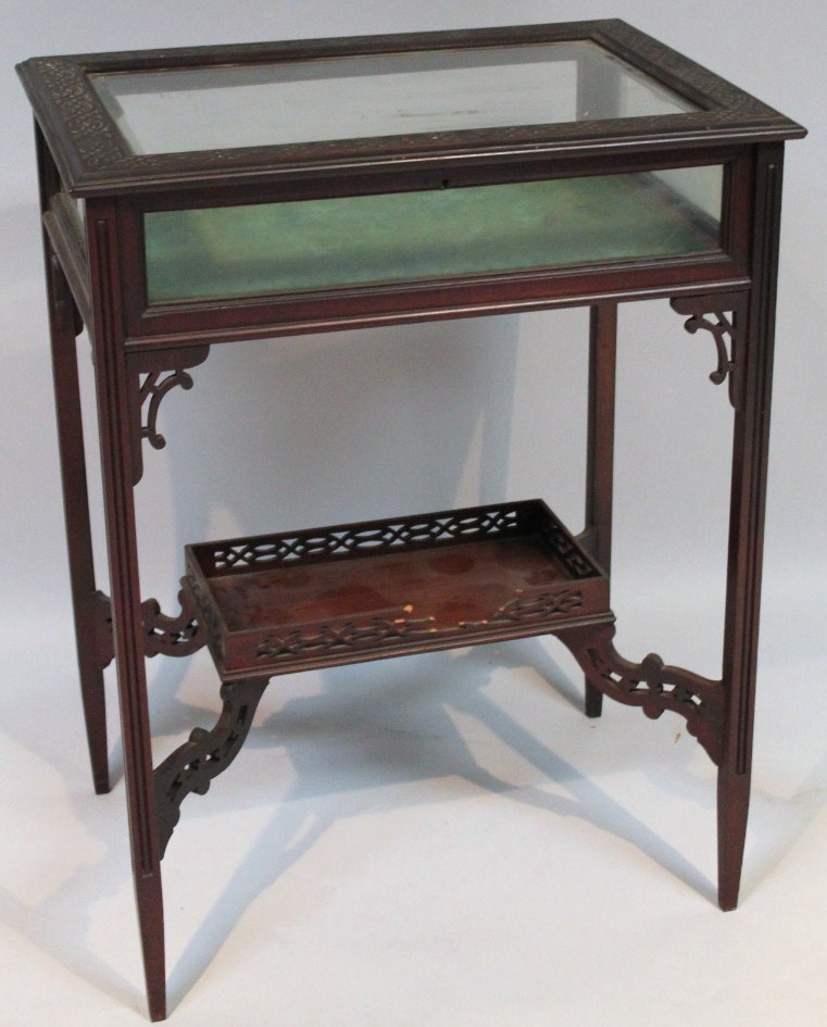the rectangular glazed top with a blind fret outline raised on slender square supports, joined by a tray under-tier with buttress style sides, the hinged lid revealing a plain part velvet lined interior