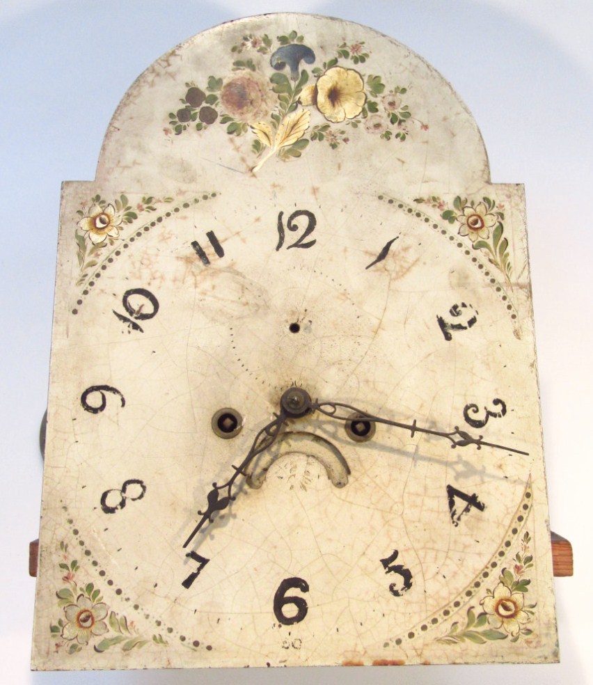 fronted by a painted arched 32cm dial, with Arabic numerals, decorated with floral spandrels with an 8-day movement
