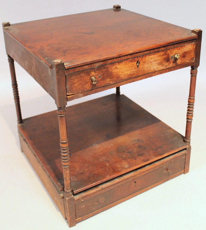 the square top with a frieze drawer above bobbin turned supports, with a further drawer beneath with fixed shelf