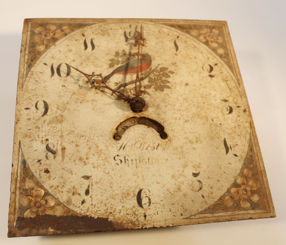 nted by a 30cm square dial with Arabic numerals and painted face, signed H Best, Shipston, with date aperture revealing thirty-hour movement