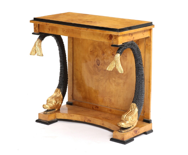 A 20th-21st century Empire style partly painted and gilded birch console, decorated with dolphins, front with drawer