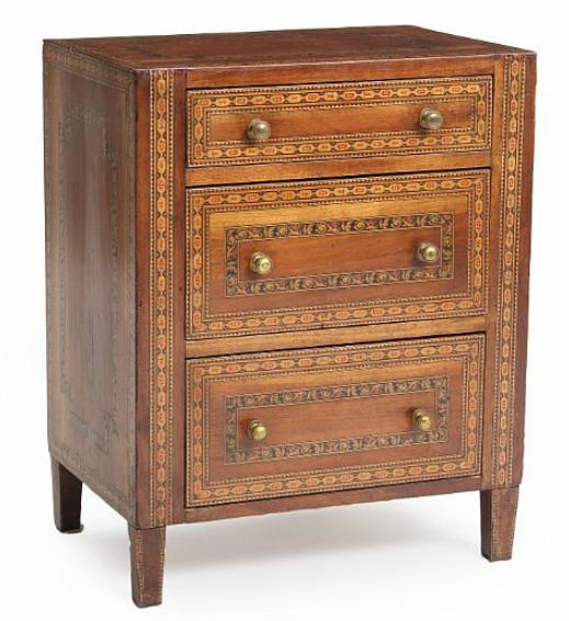 A 20th century mahogany and inlaid chest of drawers, front with three drawers