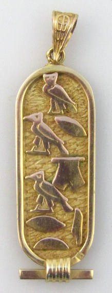 A 20thC oval Egyptian ingot, raised with hieroglyphics with oval body and plain clip top, yellow metal, bearing marks, 5cm high.