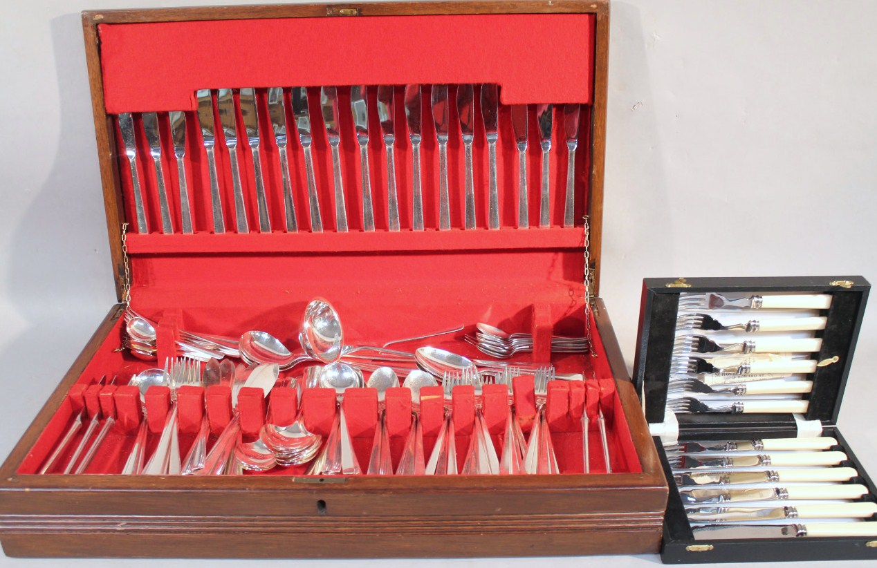 twelve piece setting in a stained beech case, 12cm high, 62cm wide, 37cm deep, and a cased set of plated fish eaters. (2)