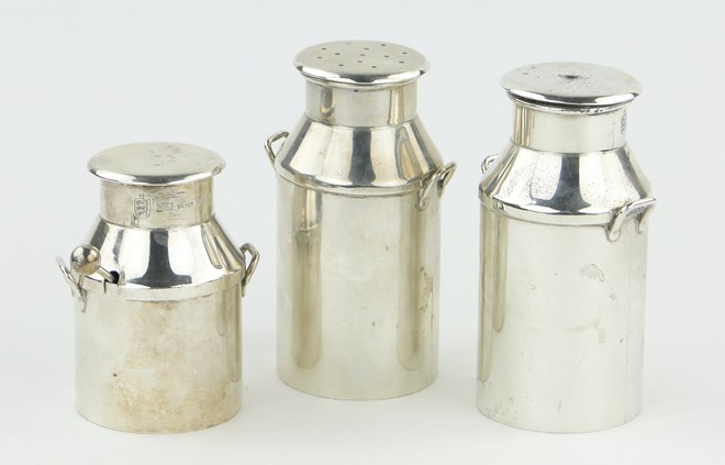 A 3-piece continental silver milk churn design cruet set, marked 925, height 8.5cm.