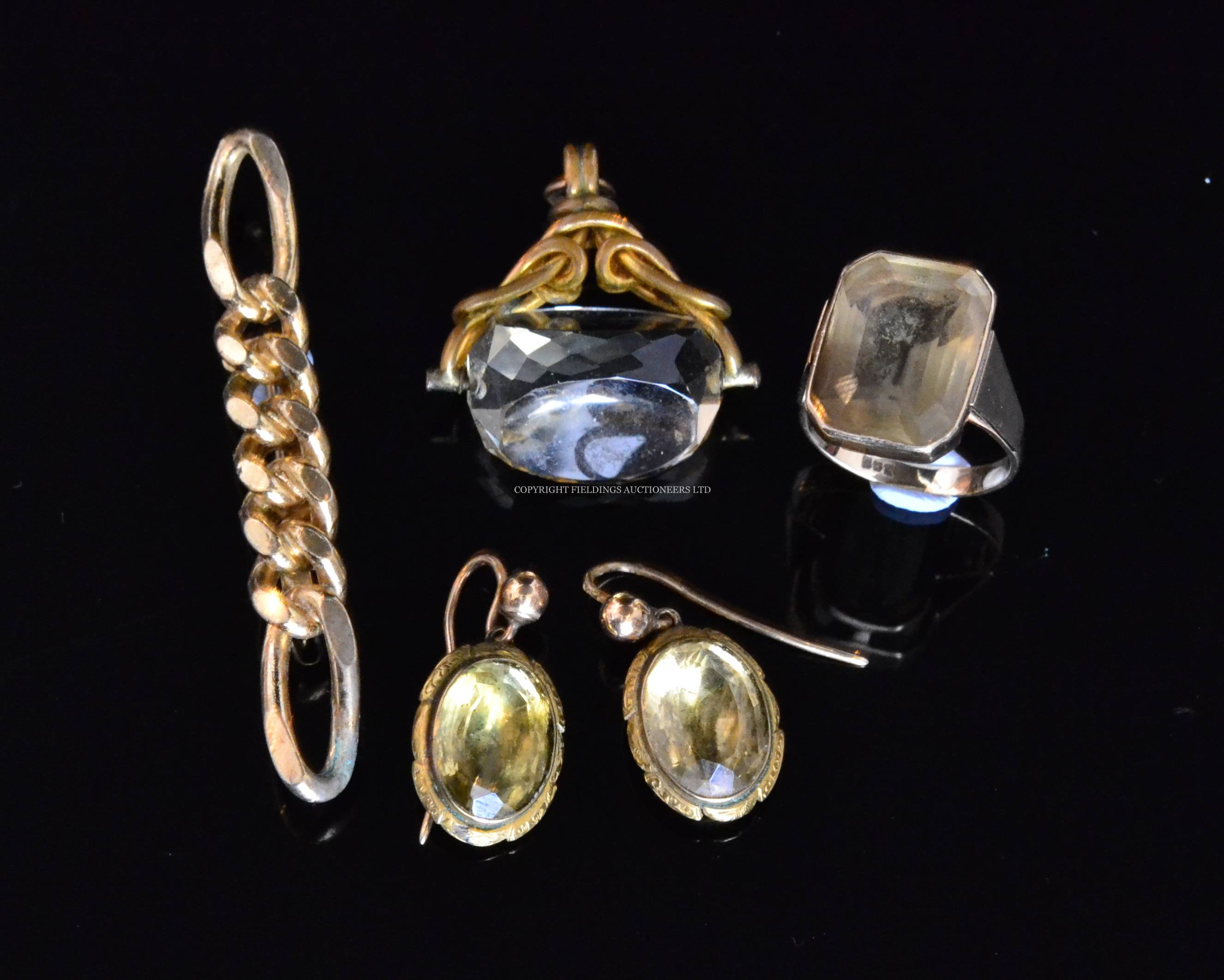 A 9ct citrine ring with rectangular facet cut stone collet set within raised mount, stamped, together with a set of closed back citrine pendant earrings, a citrine swivel fob and a brooch formed of a section of a curb link chain (5)