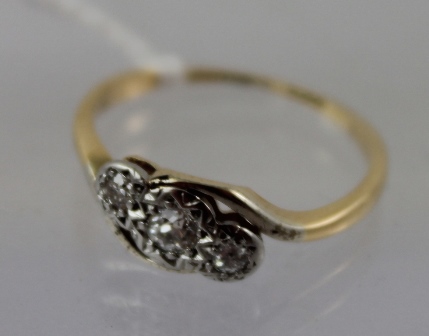 A 9CT GOLD CROSSOVER STYLE RING, set with three diamonds, size M 1/2