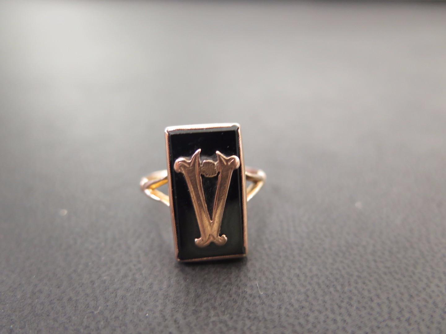 A 9ct gold onyx panel ring - With initial 'V' to the bifurcated shoulders and plain band - Hallmarked Chester