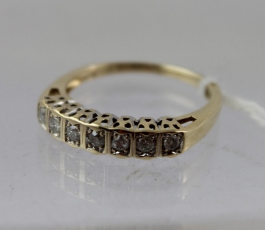 A 9CT GOLD RING, set with seven brilliant cut diamonds, size N