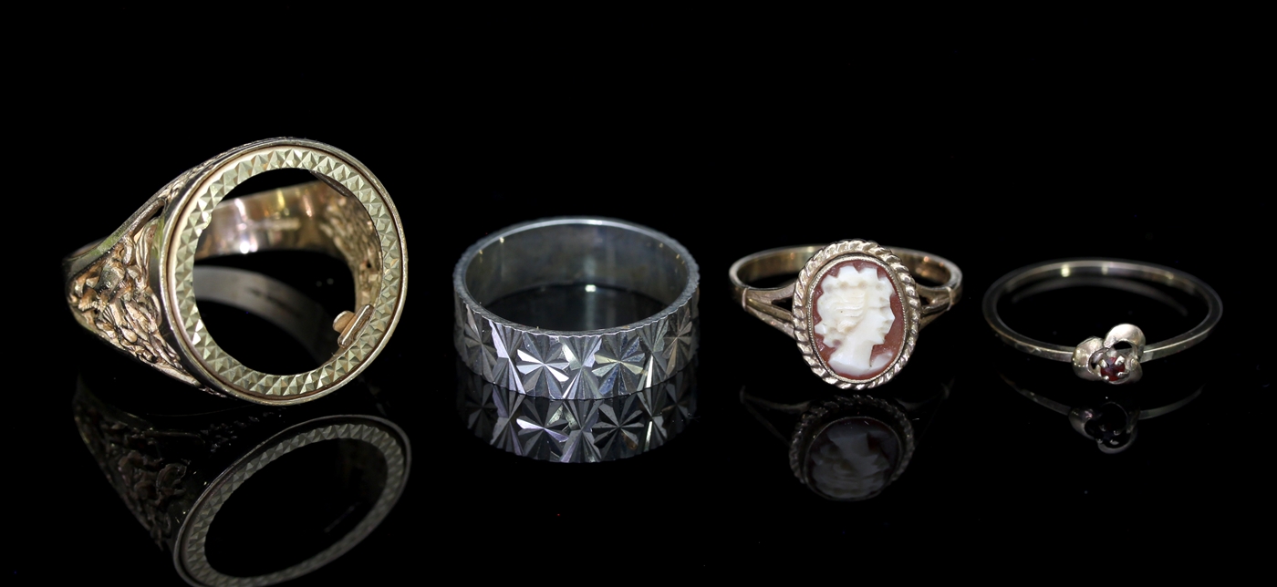 A 9ct gold ring mount, approximately 6.3gm, a cameo ring set in 9ct gold and two other rings (4)