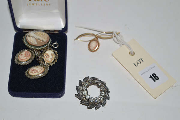 A 9ct. yellow gold brooch with cameo drop; a cameo set of brooch, earrings and pendant on chain; and a wreath pattern brooch.