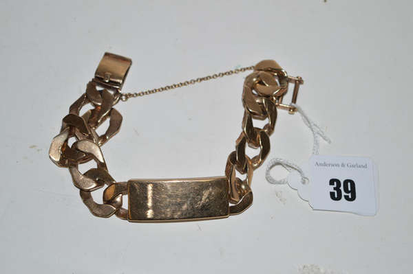 A 9ct. yellow gold gentleman's identity bracelet, of flush links with textured edging, 82grms.