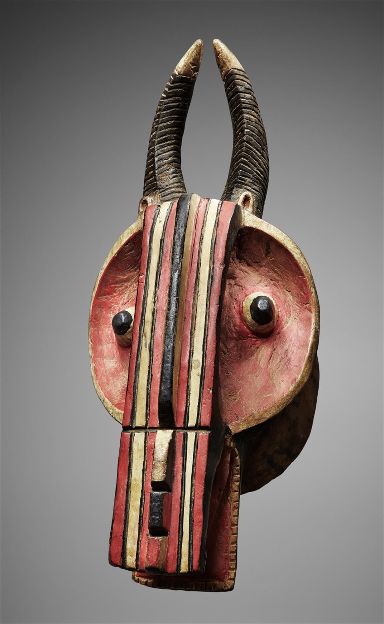 Bo nun amuin, with carved teeth in the open snout, curved horns, painted red, white and black.
