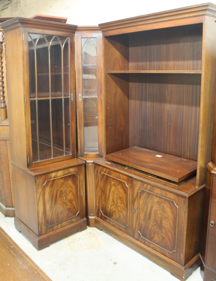 to include corner and straight display cabinets, open shelves, some fronted by glazed doors, etc, above fielded panel doors on bracket feet, 193cm high, 50cm deep.