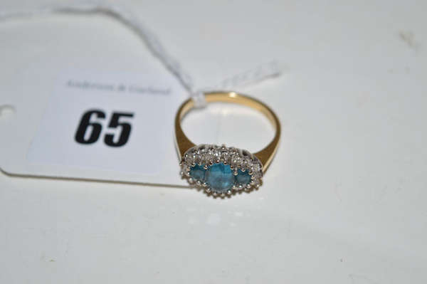 A blue stone and diamond cluster ring, the three oval facet cut graduated blue stones surrounded by eight-cut diamonds, on 18ct. yellow gold shank, ring size L.
